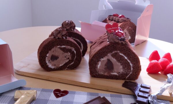 チョコチップ入りチョコクリームとチョコガナッシュをたっぷりココアスポンジで巻きました。