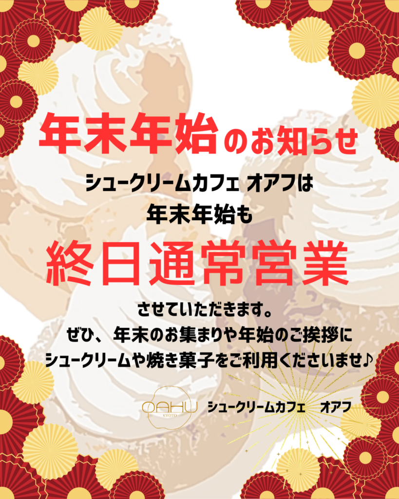 シュークリームカフェ オアフは年末年始も通常営業させていただきます。