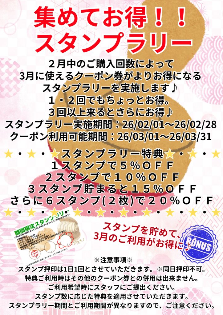 2月イベント「スタンプラリー」をこの度実施いたします。お買い物に来るとより3月にお得にご利用いただけるクーポン券となるスタンプラリーです♪